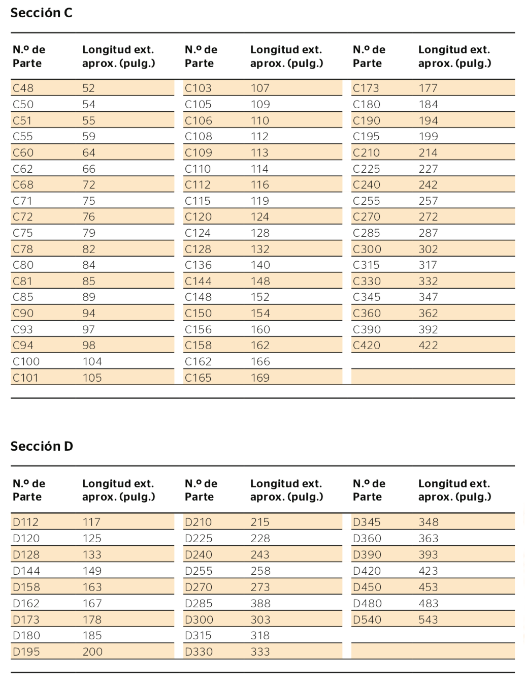 Secciones transversales y longitudes disponibles