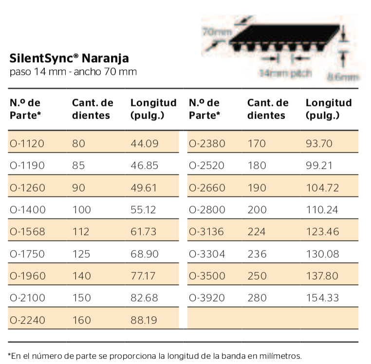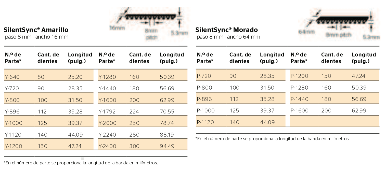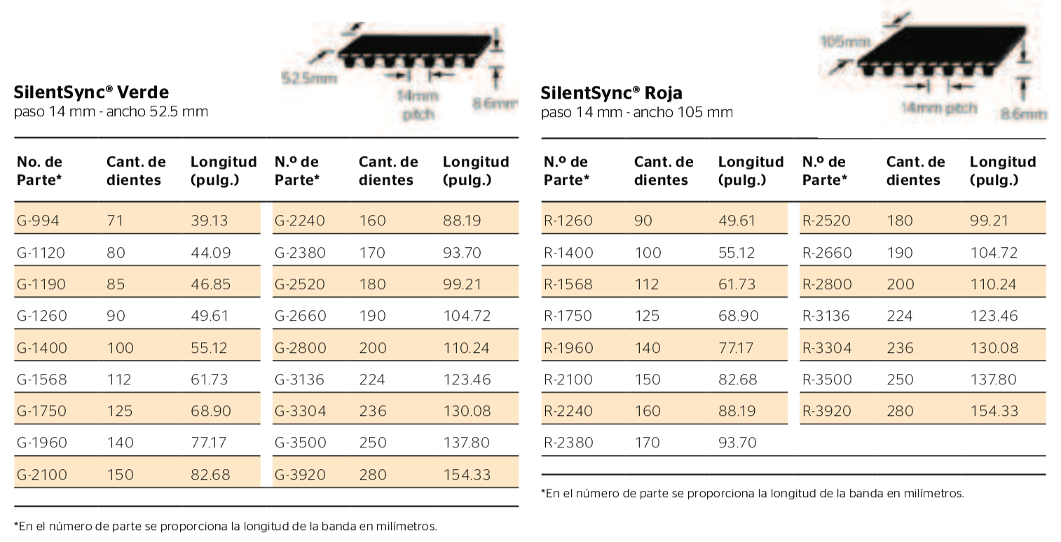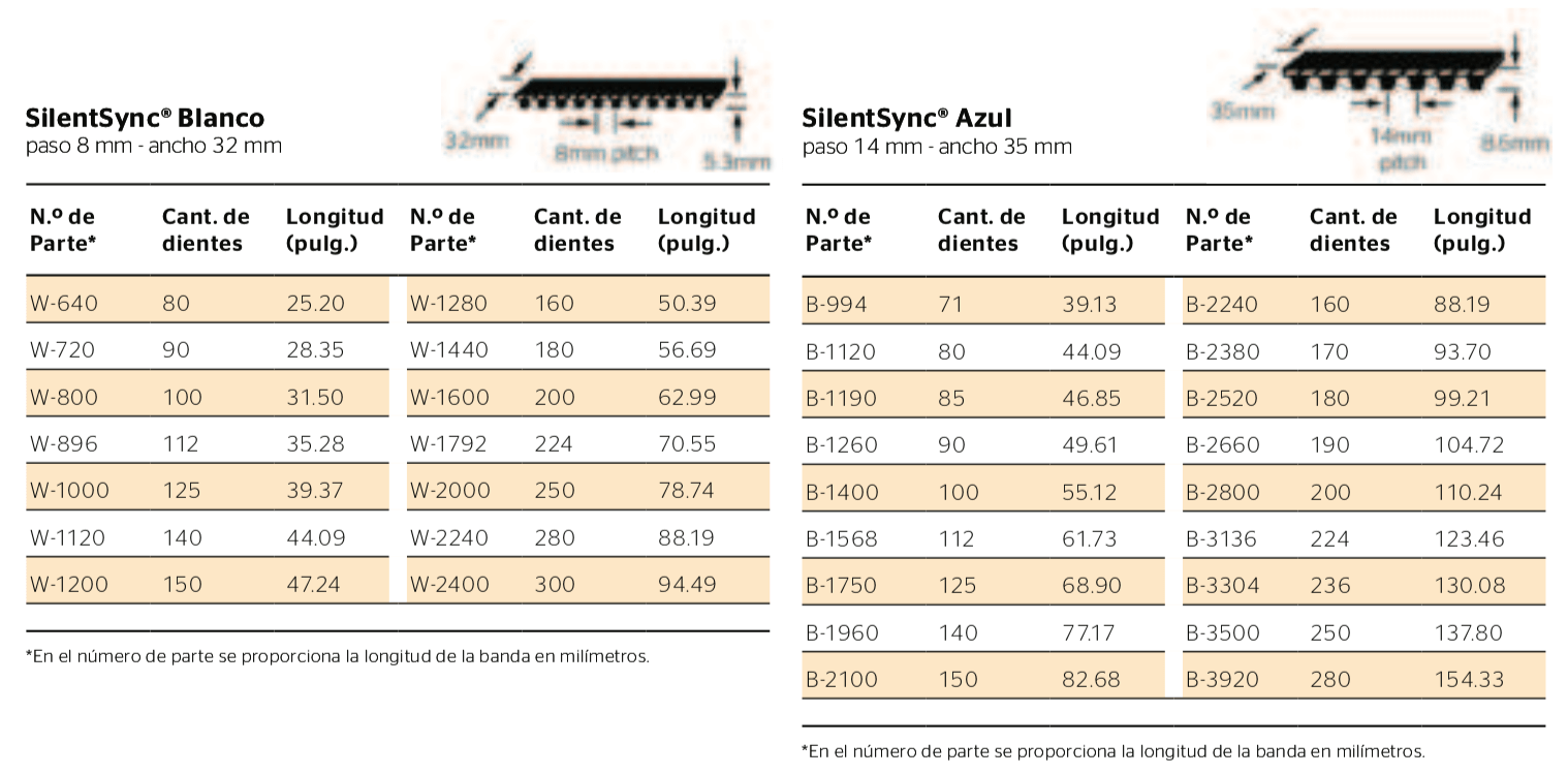 A diferencia de las cadenas de transmisión, las bandas y sprockets de SilentSync® no requieren lubricación. Después del arranque inicial y de revisar la tensión 8 horas después de iniciar la operación, las bandas SilentSync® no requieren de tensión adicional como ocurre con las bandas en V y las cadenas.